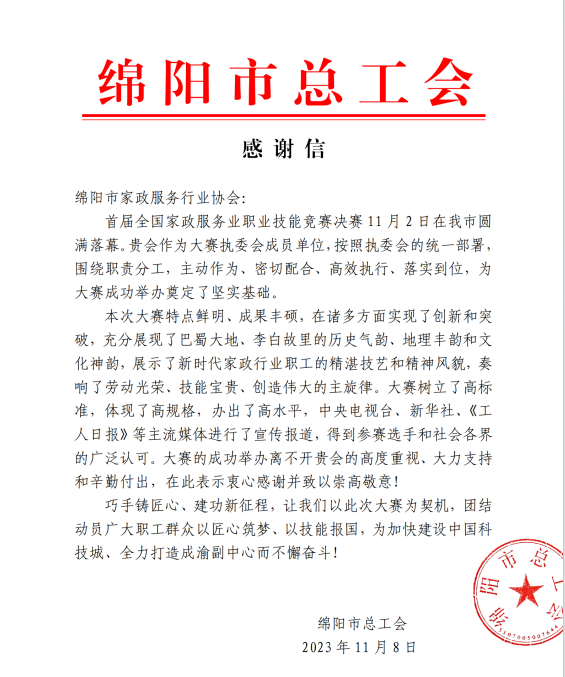 綿陽市家政服務(wù)行業(yè)協(xié)會(huì)力助首屆全國家政服務(wù)業(yè)技能競(jìng)賽決賽在綿陽圓滿落幕,綿陽市總工會(huì)高度贊揚(yáng),綿陽市美新家政熱烈祝賀!